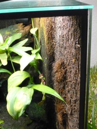 Unten ist ein T-Winkel auf der Gaze und dem Glassteg vorne geklebt, der einen sauberen Abschluß ergibt und verhindert das die Scheibe nach unten wegrutscht. Wenn die Scheibe in der Front steht ergibt sie eine Fläche mit den Seitenscheiben und Futtertiere wie auch kleine Gecko´s haben es schwer zu entkommen.