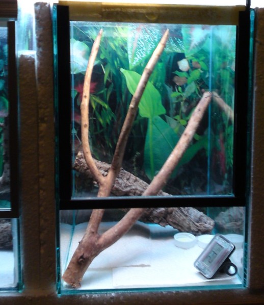 Beide Minis sind noch in einem Terrarium (LxBxH: 20x20x30cm), was aber eher wie ein Quarantäneterrarium aussieht. Für echte Pflanzen ist es zu klein.
