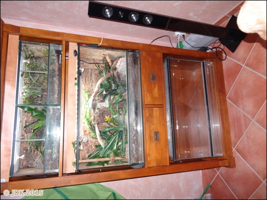 Das sind die zwei 45er Terrarien und das 90er (unten das weitere nicht genutzte 90er Terrarium)