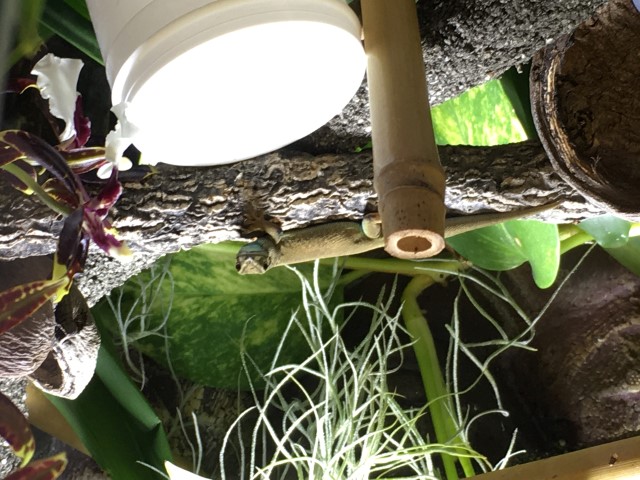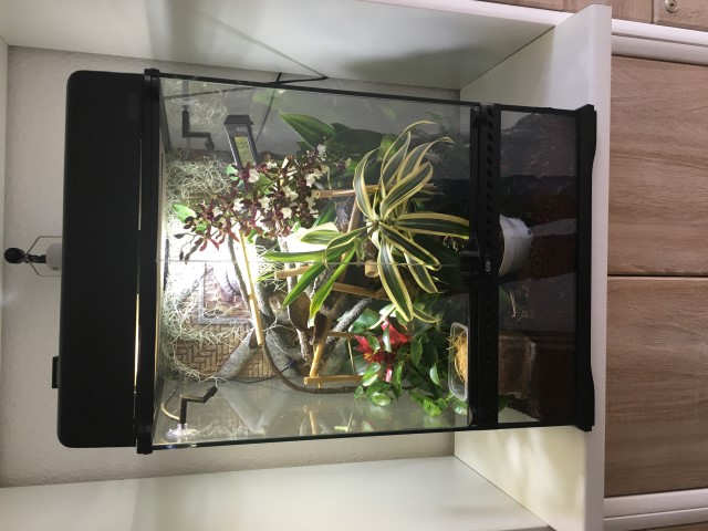 Terrarium: ExoTerra 45x45x60 Lampe: LuckyReptil Bright Sun 50Watt incl. Vorschaltgerät 35/50Wa Lampe: ExoTerra Aufsatz 45cm für 2 x Zusätzliches UV Licht Max.2x25Wat Regenanlage: ExoTerra Monsun RS400