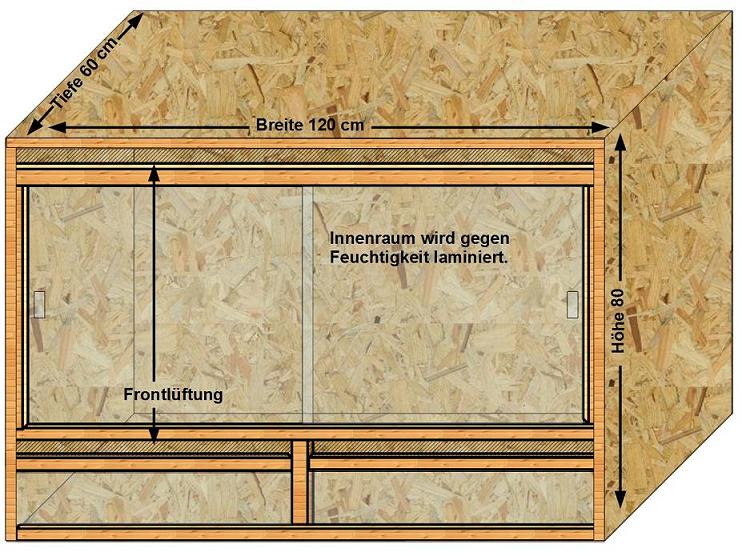 Ich bräuchte ein paar Infos über die Temperaturen und die Luftfeuchtigkeit bei der Haltung von Gonatodes-Arten. Ich beabsichtige mir ein Terrarium für diese Tiere in den folgenden Maßen zuzulegen: Breite 100 cm, Tiefe 50 cm, Höhe 80 cm. Lebensraum Tropenwald oder Tropischer Regenwald. Ich möchte vor allem sehr viele Pflanzen darinnen pflegen, eventuell auch einen kleinen Wasserfall oder Quellstein einbauen. Welche Tiere wären denn da geeignet und vor allem kann ich 2 verschiedenen Gruppen a´ 1.3 bzw. 1.2 darinnen halten oder würde das nicht funktionieren? Könnte dann bei zwei Arten eine Boden bewohnende Art und eine Baum bewohnende Art sein, damit die Tiere sich nicht so sehr ins Gehege kommen. Währe nett wenn ich ein paar Infos und Vorschläge bekommen könnte. Beleuchtung soll über 3 Leuchtstoffröhren und über 3 Halogenspots (wegen der Wärme) geregelt werden. Eine Heizschlange über 1/3 des Bodengrundes, da bin ich noch am überlegen wird aber wahrscheinlich notwendig sein um auf die entsprechenden Temperaturen zu kommen. Last not least bleibt noch die Frage nach dem Material für das Terrarium, OSB oder Glas, wobei ich momentan mehr nach OSB tendiere, da die Wärmeisolation wesentlich besser ist als im Vergleich zu Glas. Das Terrarium würde dann etwas größer was ja eigentlich gut sein dürfte. Welche Erfahrung habt ihr damit. Anbei Zeichnung: