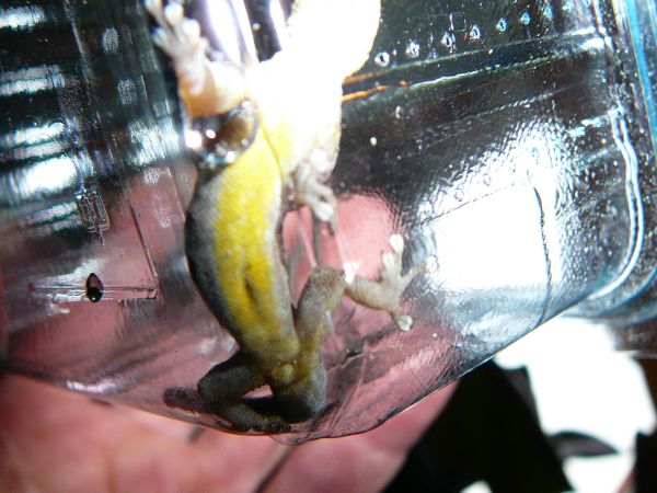 Ich habe gestern aufgrund einer Anzeige ein Terrarium von privat gekauft. Bei der Abholung stellte der Vorbesitzer die Frage, ob wir die 3 Zwerggeckos, die dort drinnen lebten, haben wollten. Er wollte sie nicht mehr, da sie ihm zu langweilig seien. Bevor sie ins Klo oder sonstwohin wanderten, haben wir sie mitgenommen. Der Typ will sich jetzt Bartagamen holen, deswegen mußte das Terrarium weg.